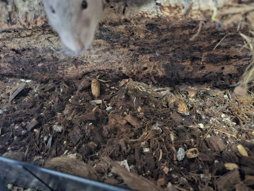 Your bioactive cage should include a generous amount of Isopods and Springtails. The Isopods will break down large organic matter (waste, spilled food) and the Springtails continue that by breaking down what the Isopods leave behind. These bugs will require a moist/damp substrate layer to live, and they enjoy hiding underneath things. Try including cork bark (you can see some blue Isopods climbing on the bottom of the bark in the above picture.