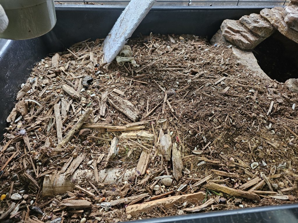 A good substrate base for a bioactive cage is coconut fibers/soil. These hold moisture well and provide a living base for the bugs and microorganisms that will provide the ecosystem that breaks everything down. You will still need to do spot cleans and you may need to turn the soil to mix everything in, but the substrate should be generally self-cleaning and a lot less smelly than traditional bedding options.